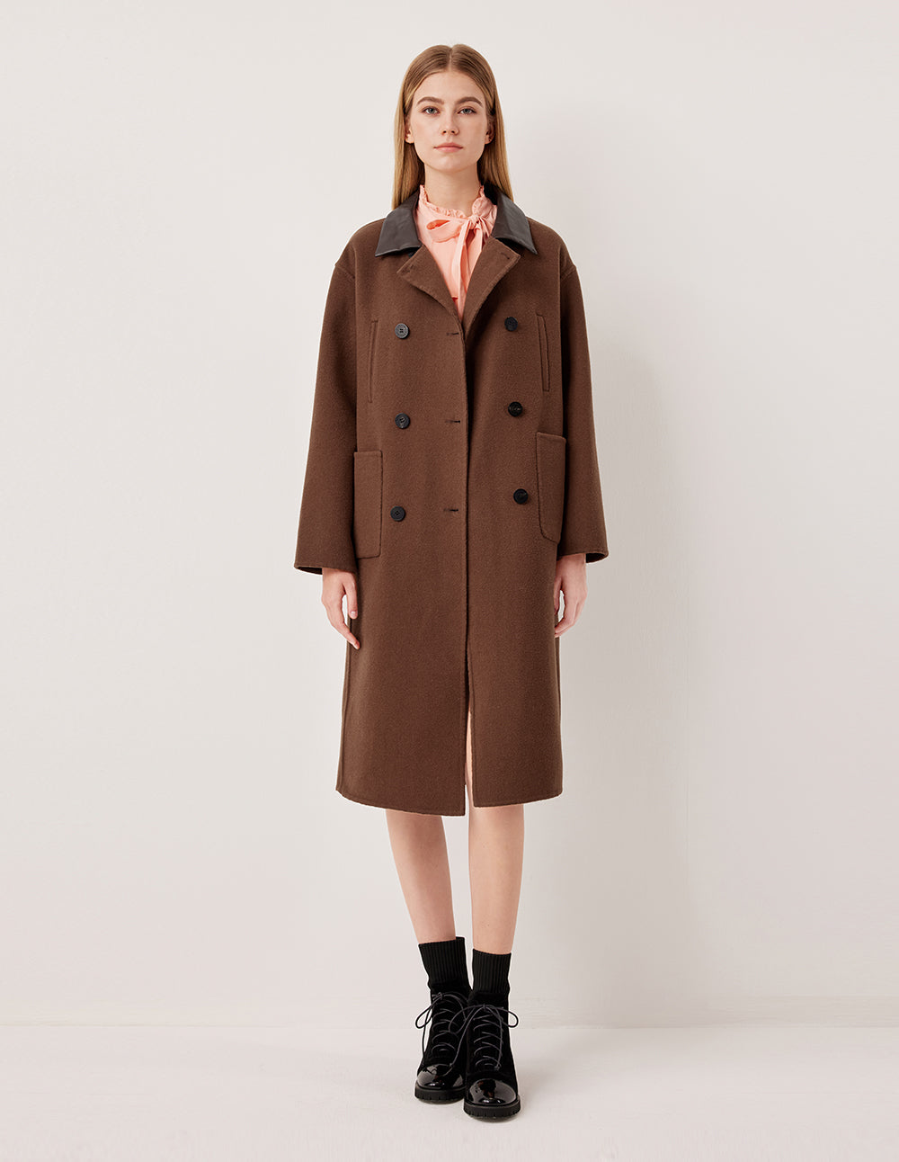 MARYLING Sheepskin Collar Patchwork Alpaca Double-Breasted H-Line Coat