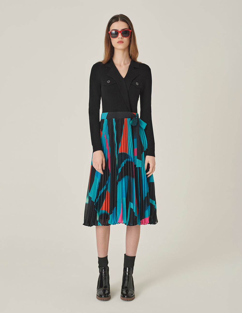 MARYLING Crew Collar Knitted Patchwork Printed Pleated Midi Dress