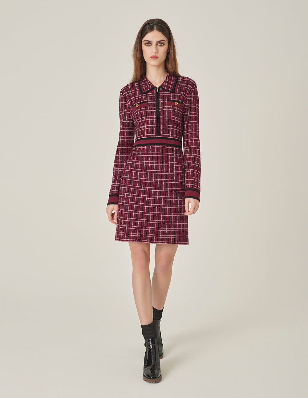 MARYLING Red & Black Plaid Long-Sleeve Imitation Tweed A-Line Knitted Midi Dress