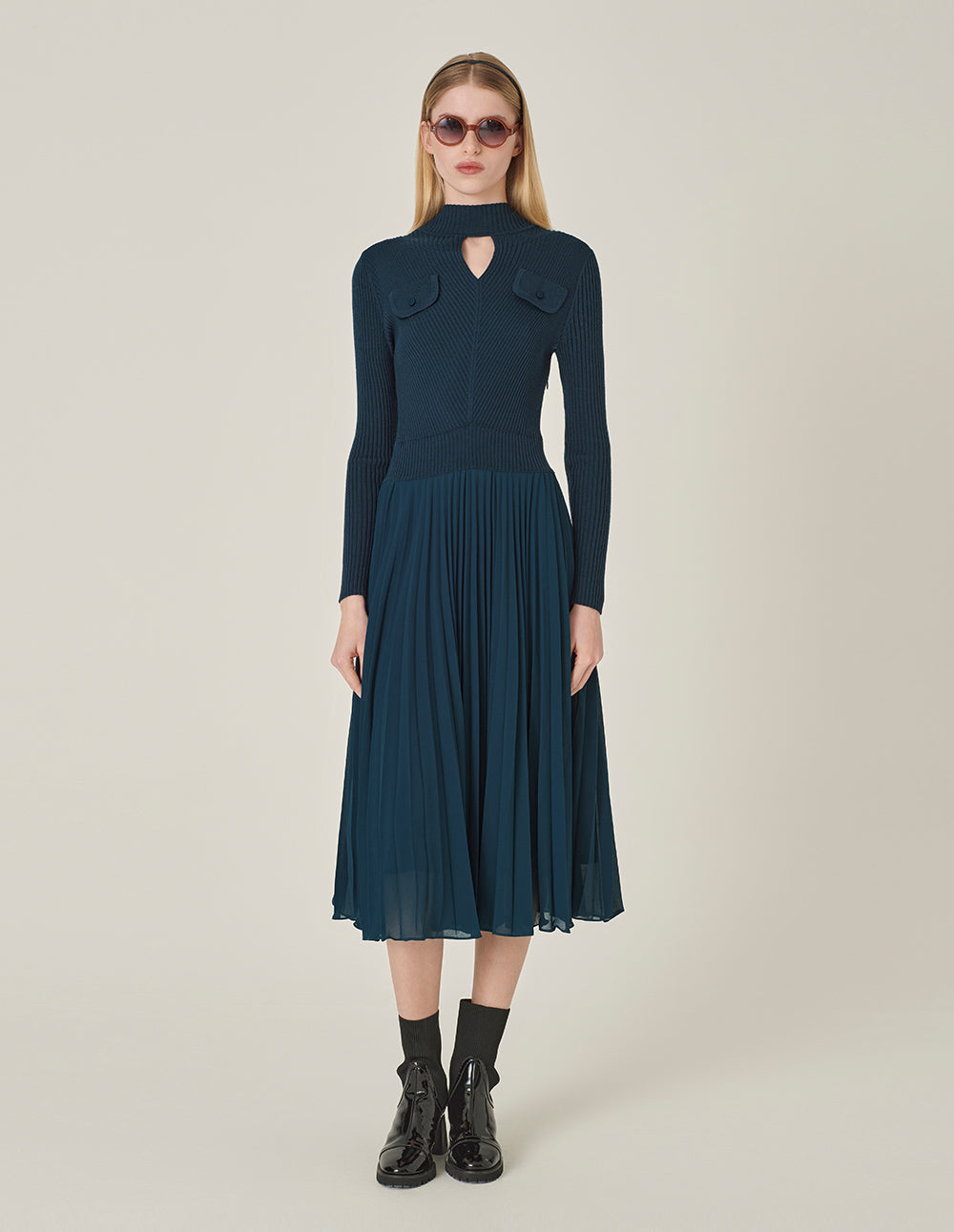 MARYLING High Collar Long Sleeve Knitted Patchwork Pleated Midi Peacock Green Dress