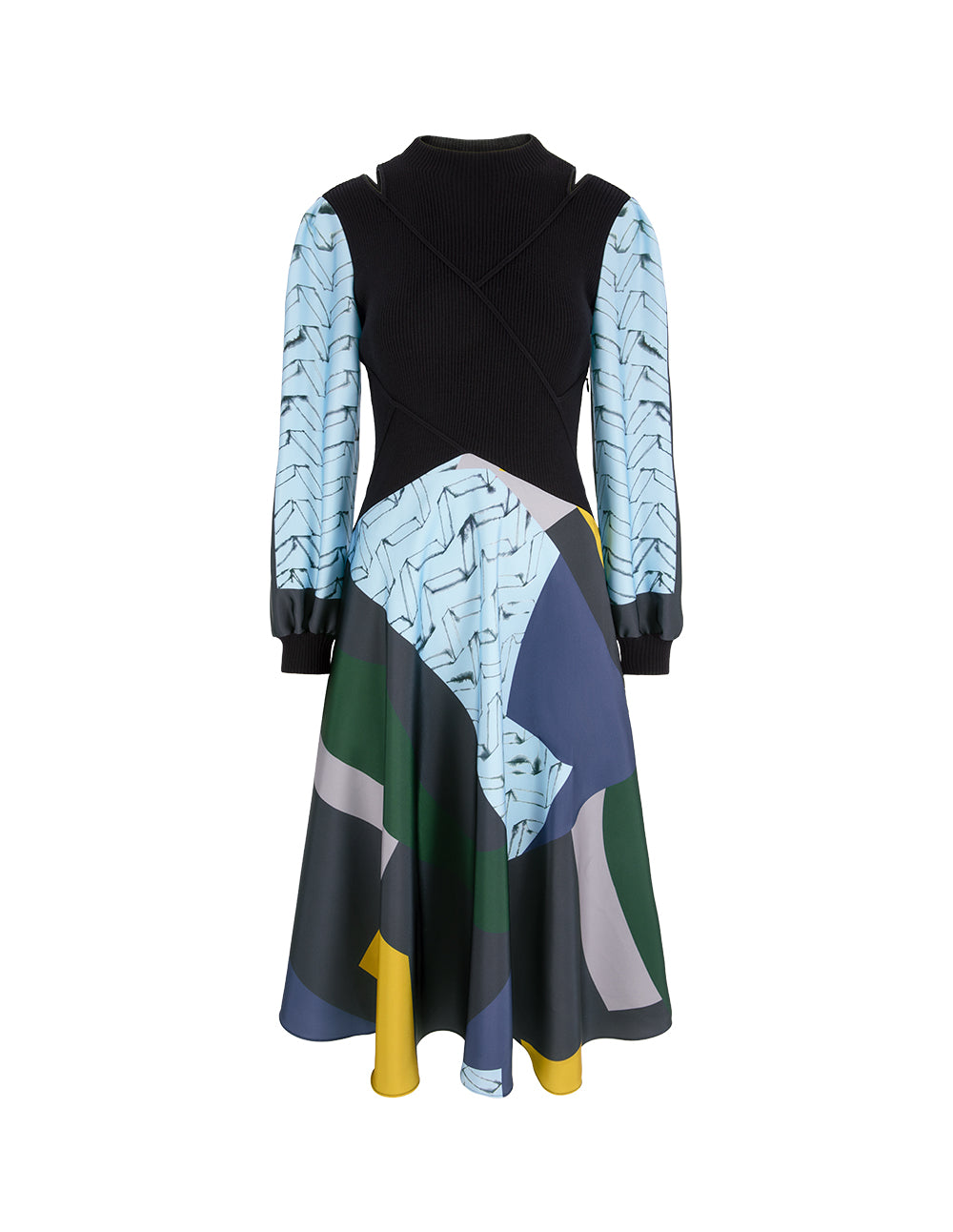 MARYLING High-Neck Shoulder-Cutout Puff-Sleeve Printed Patchwork Knitted Midi Dress