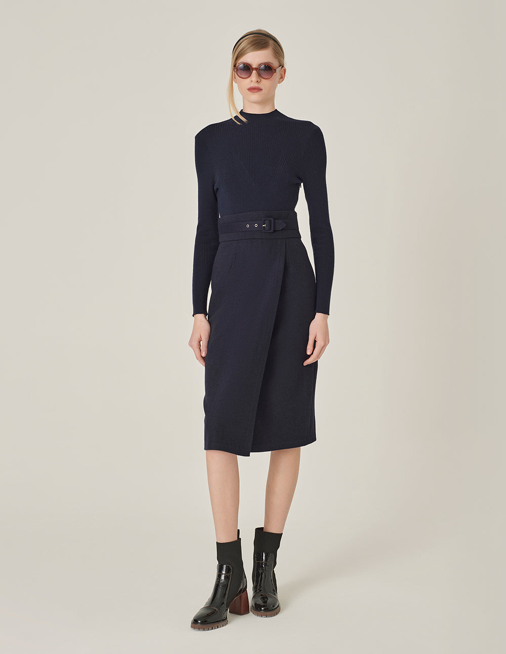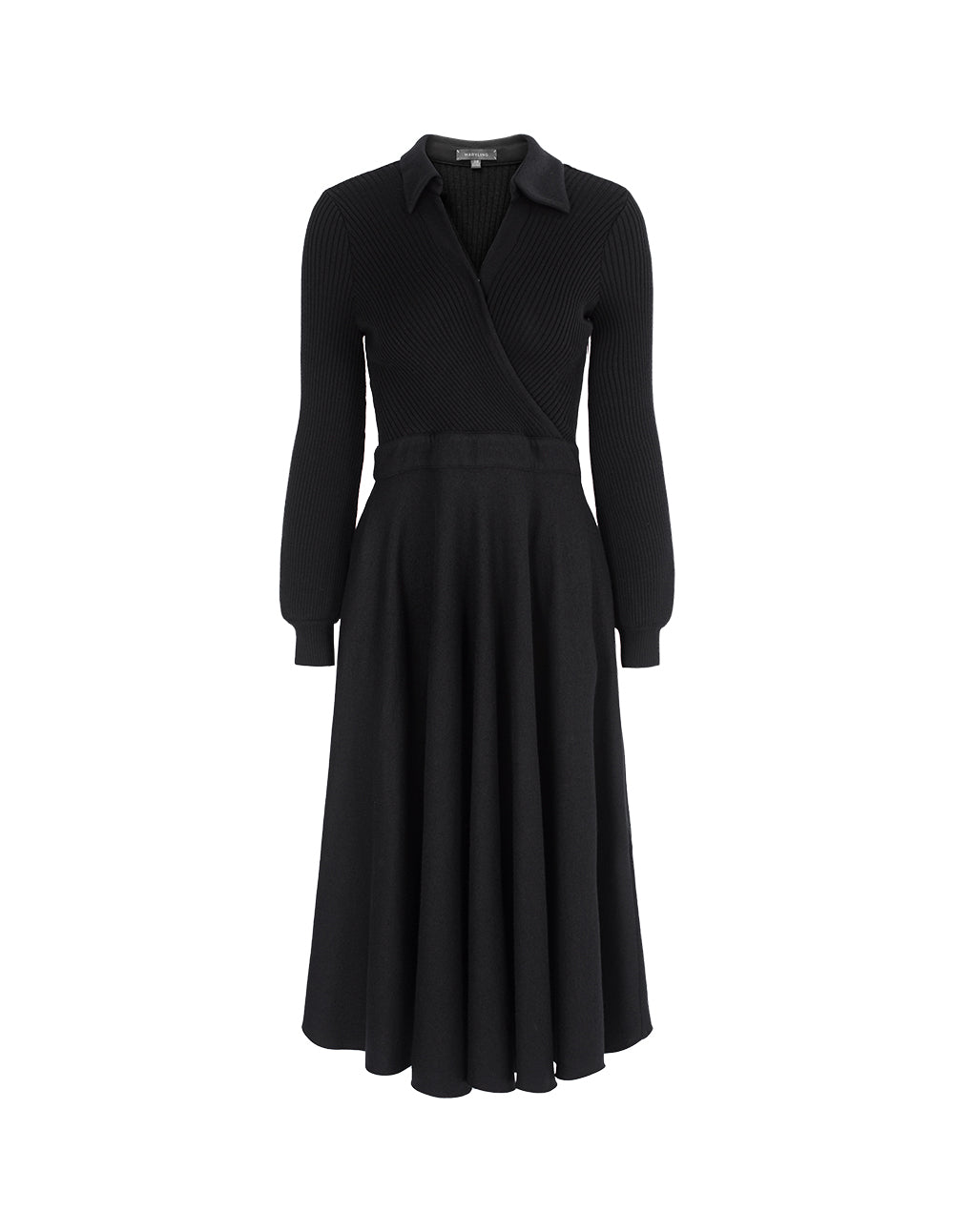 MARYLING Shirt-Collar Wrap Knitted Patchwork Pleated Midi Dress
