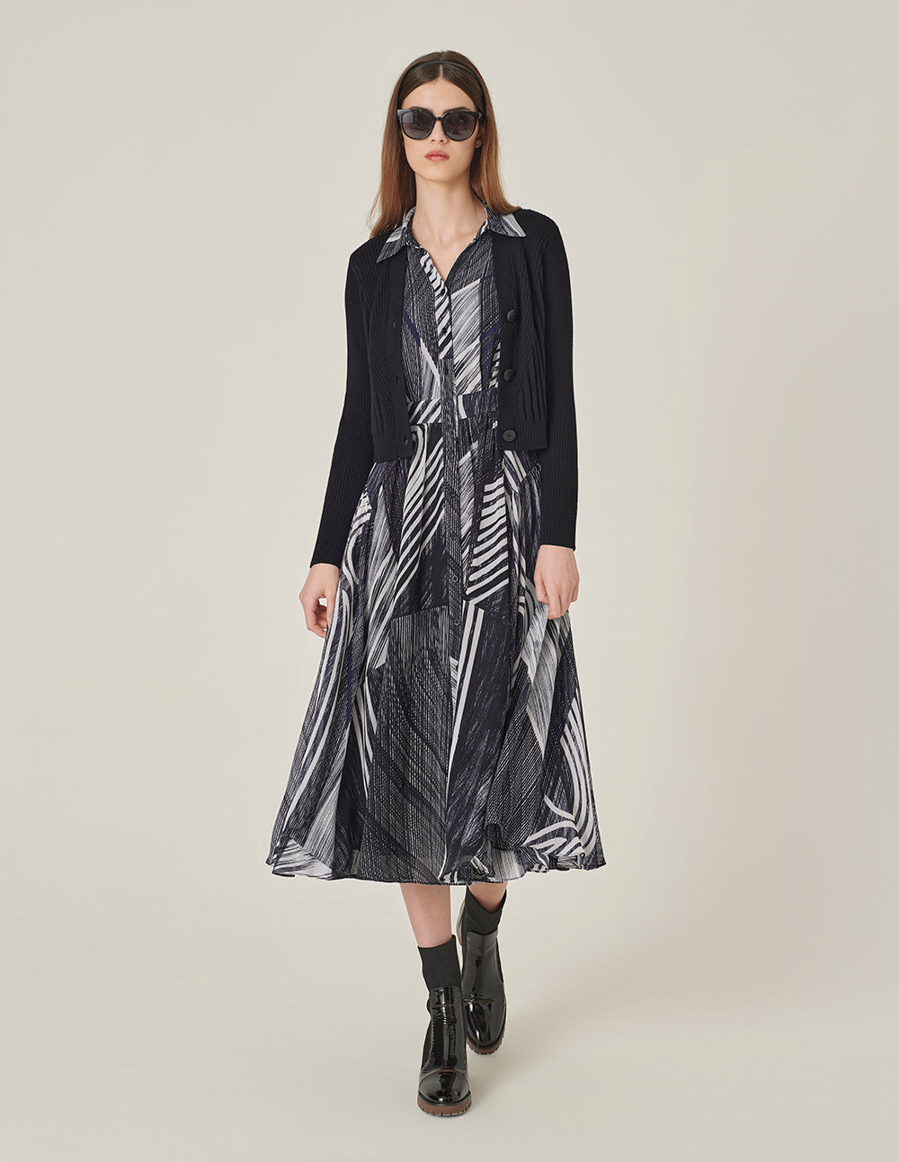 MARYLING Black & White Patchwork Midi Pleated Shirt Dress