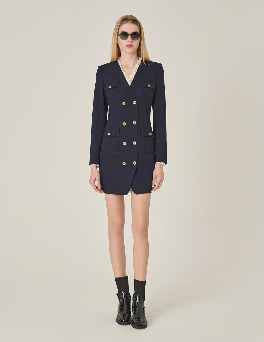 MARYLING Dark Blue V-Neck Long-Sleeve Double-Breasted Shift Mini Dress