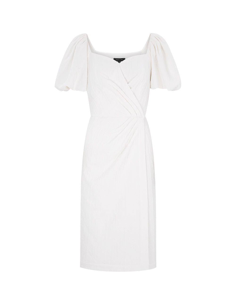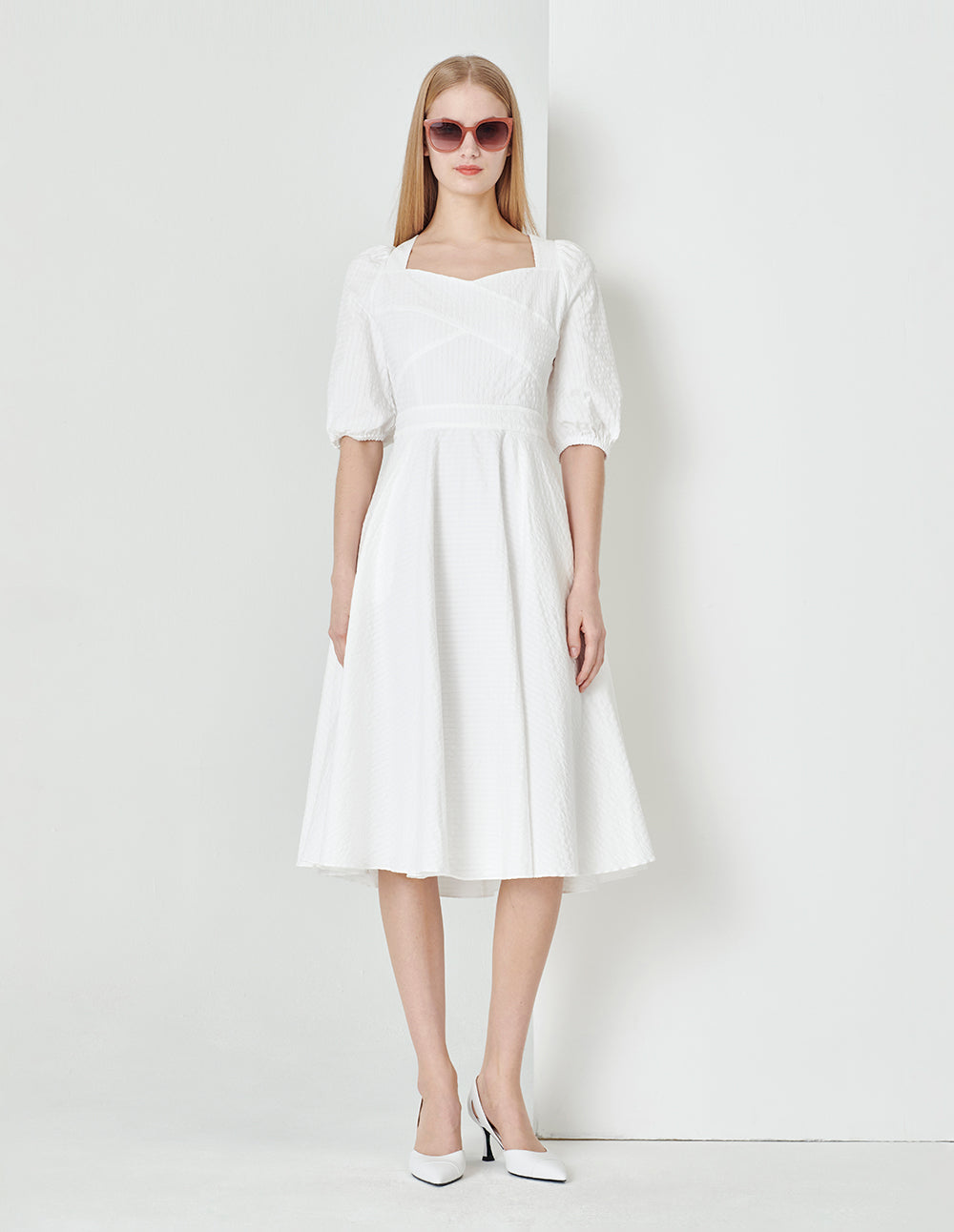 MARYLING Ivory White Square Neck Bubble Sleeve Jacquard Straight Dress