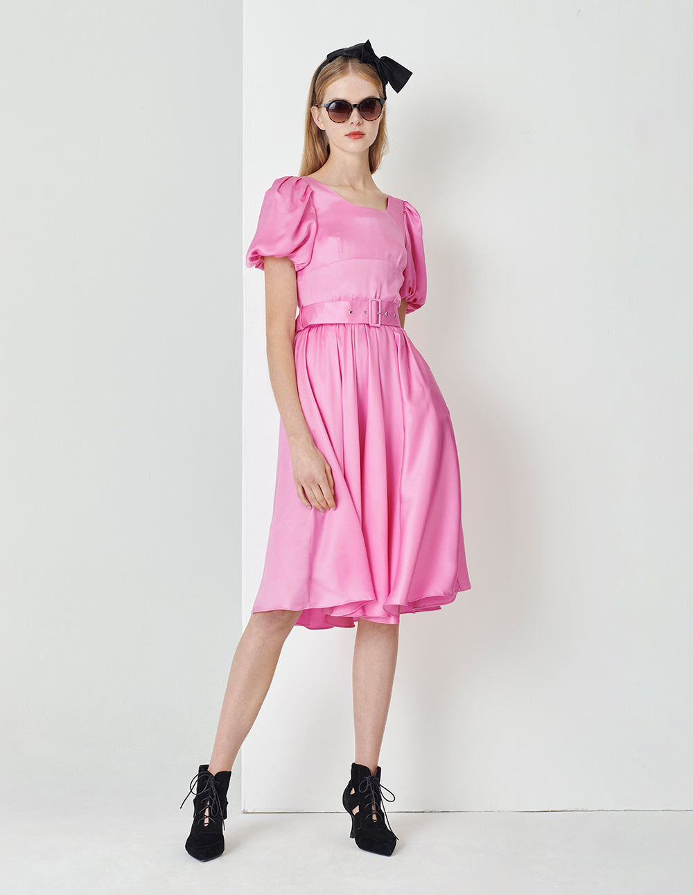 MARYLING Peach Pink Square Neck Bubble Sleeve Belted Dress