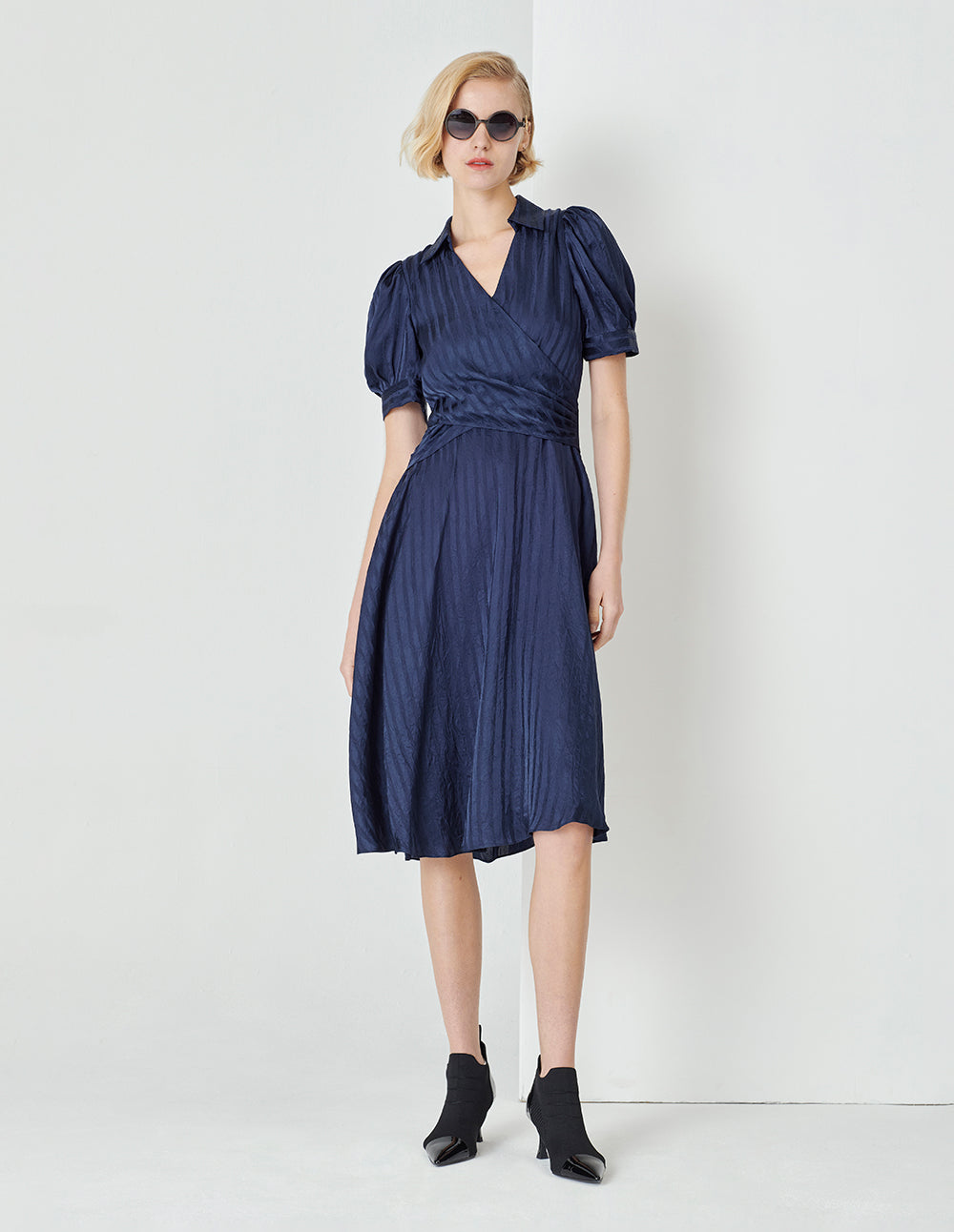 MARYLING Midnight Blue V-Neck Umbrella Hem Striped Dress