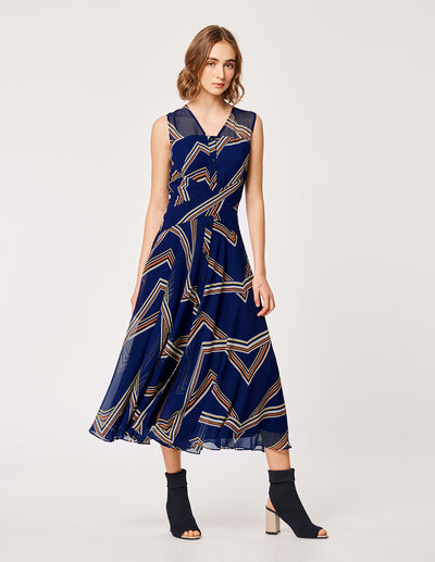 MARYLING DRAPE NECK BRAID GEORGETTE PRINT MAXI-DRESS