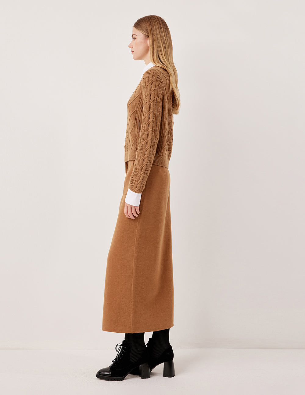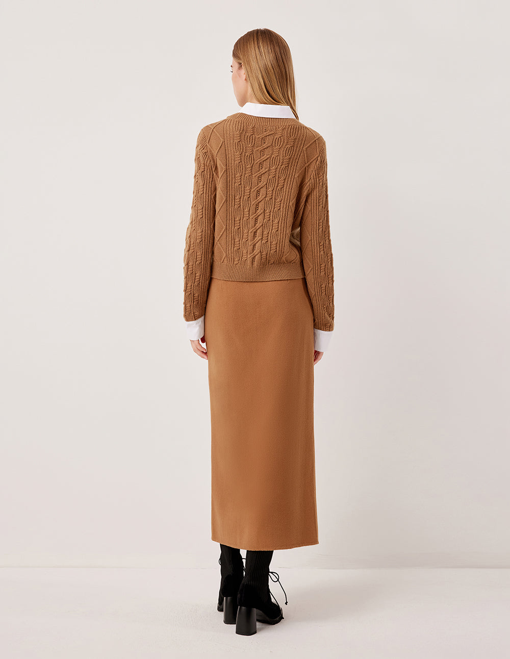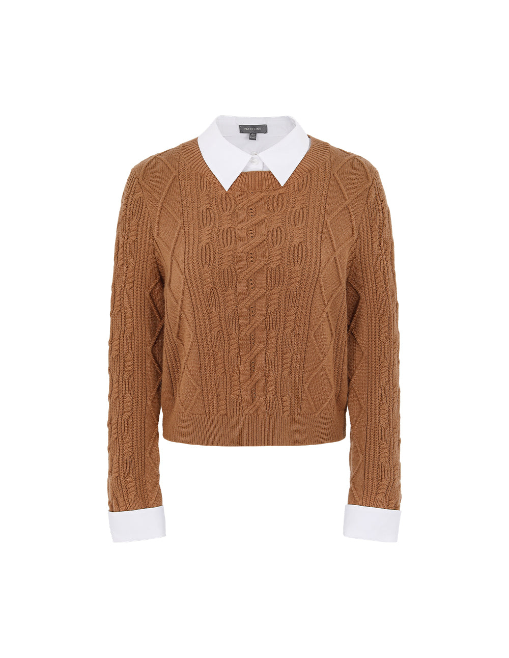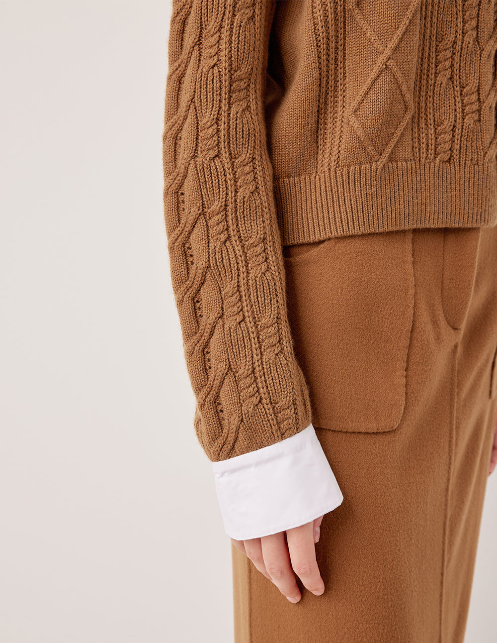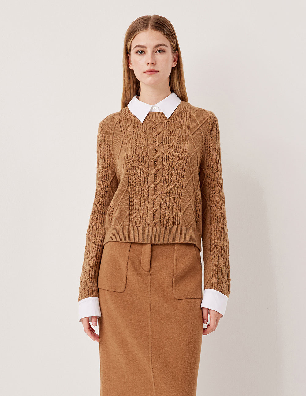 The classic white shirt and cable-knit sweater are cleverly layered together to create a single piece. The camel-colored wool cable knitting technique utilizes traditional cable knitting techniques, creating a three-dimensional pattern that resembles a delicate relief. The white shirt lapel adds a fresh visual touch, bringing a touch of preppy energy.