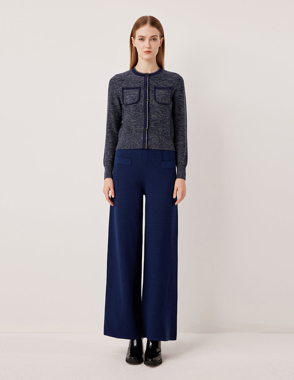 MARYLING Round Neck Ribbed Variegated Blue Wool Cardigan