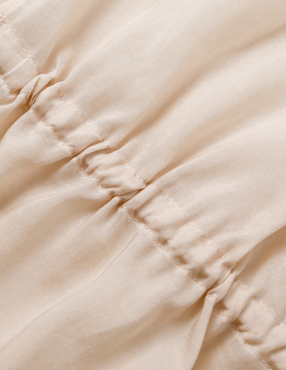 It has an elegant and transparent temperament, with a soft apricot color. The three-dimensional pinch pleat design on the shoulders and waist forms a naturally flowing line. The lantern sleeves are fluffy and moderate. The cuffs are slightly tucked in to cleverly hide the arm fat, exuding a retro elegance in every gesture.