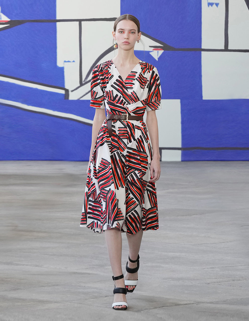 This dress is crafted from crisp and natural precision cotton, illuminated by an artistic abstract brushstroke print, with puffed sleeves and a crossover V-neck that adds a touch of Italian flair to your summer look.