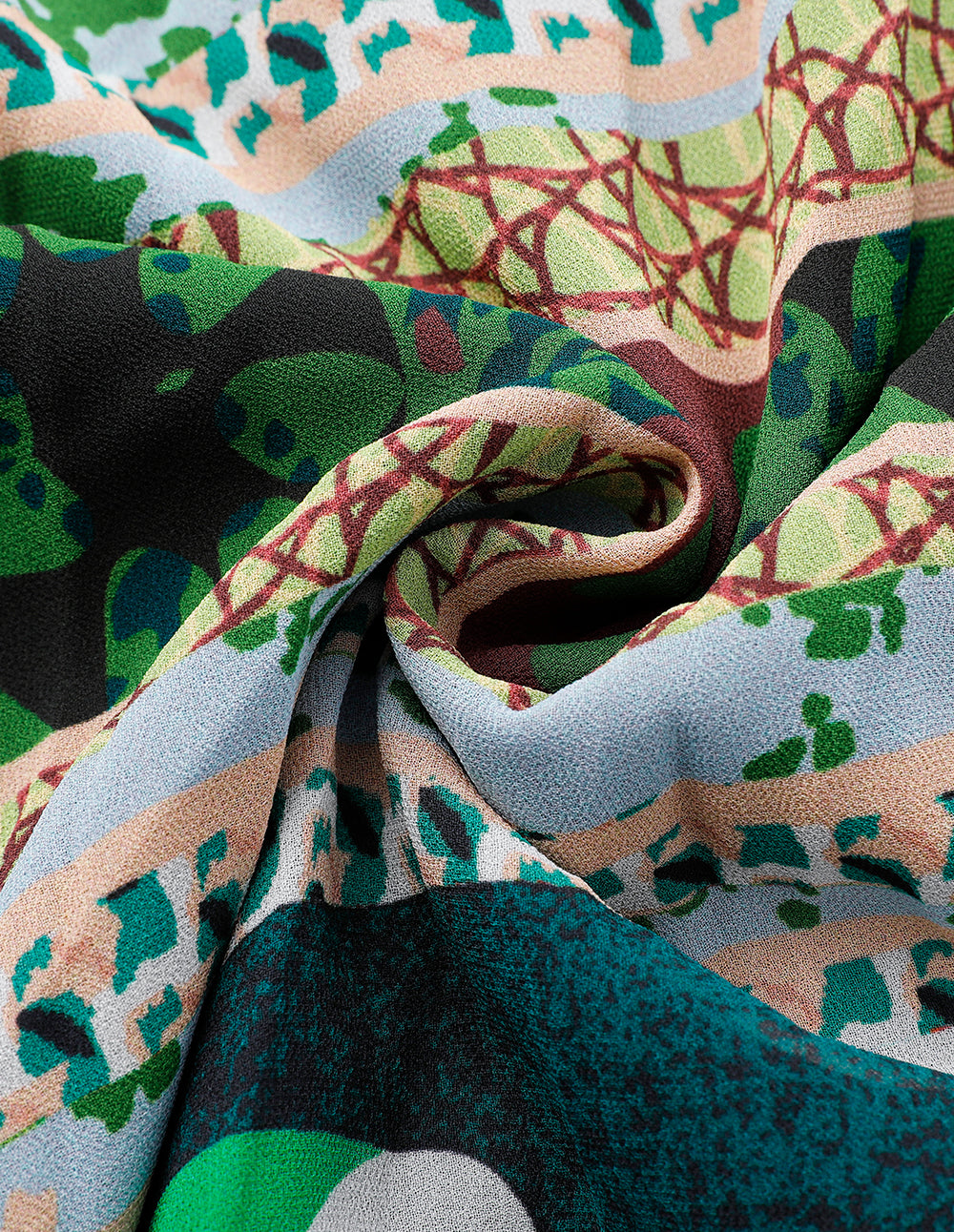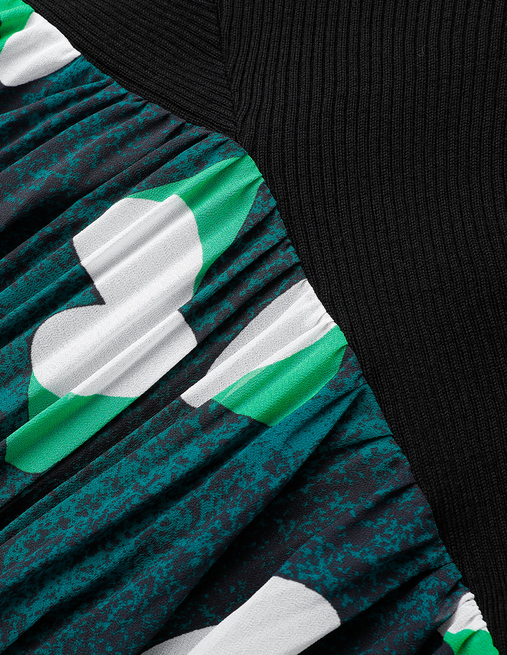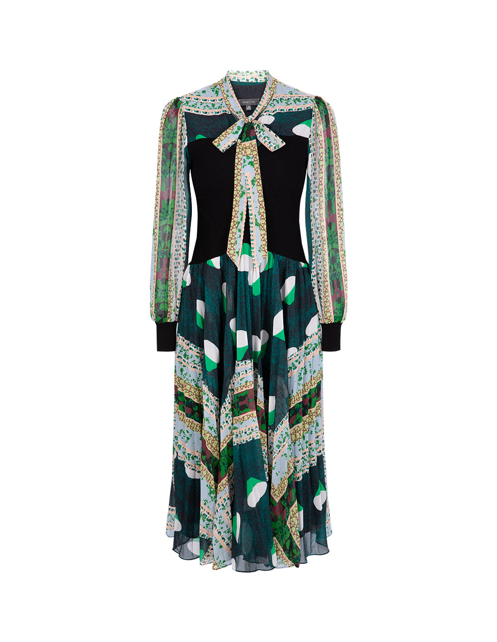 MARYLING's dress is crafted from a blend of wool and printed georgette fabric. The neckline is elegantly tied with a soft, generous bow. The inverted V-design in wool and the sun-pleat detailing on the skirt effortlessly create an elegant and sophisticated feminine silhouette.