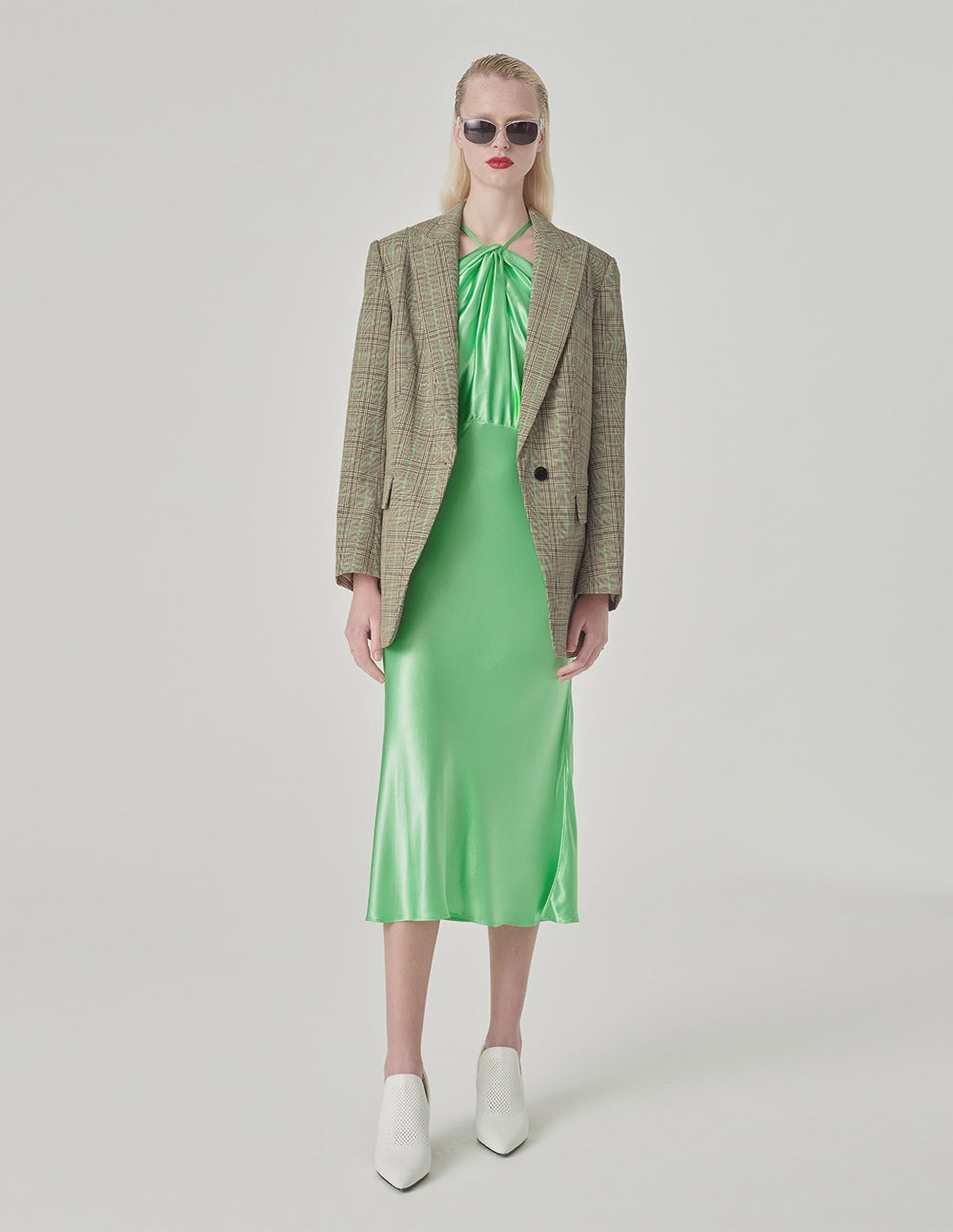MARYLING's suit jacket uses a modern, elegant aesthetic to express unrestrained female confidence. Apple‑green lines are interwoven with coffee‑toned plaid elements, while clean, graceful tailoring is integrated into a relaxed, dimensional cut for effortlessly chic style. A subtle retro touch adds a contemporary edge.