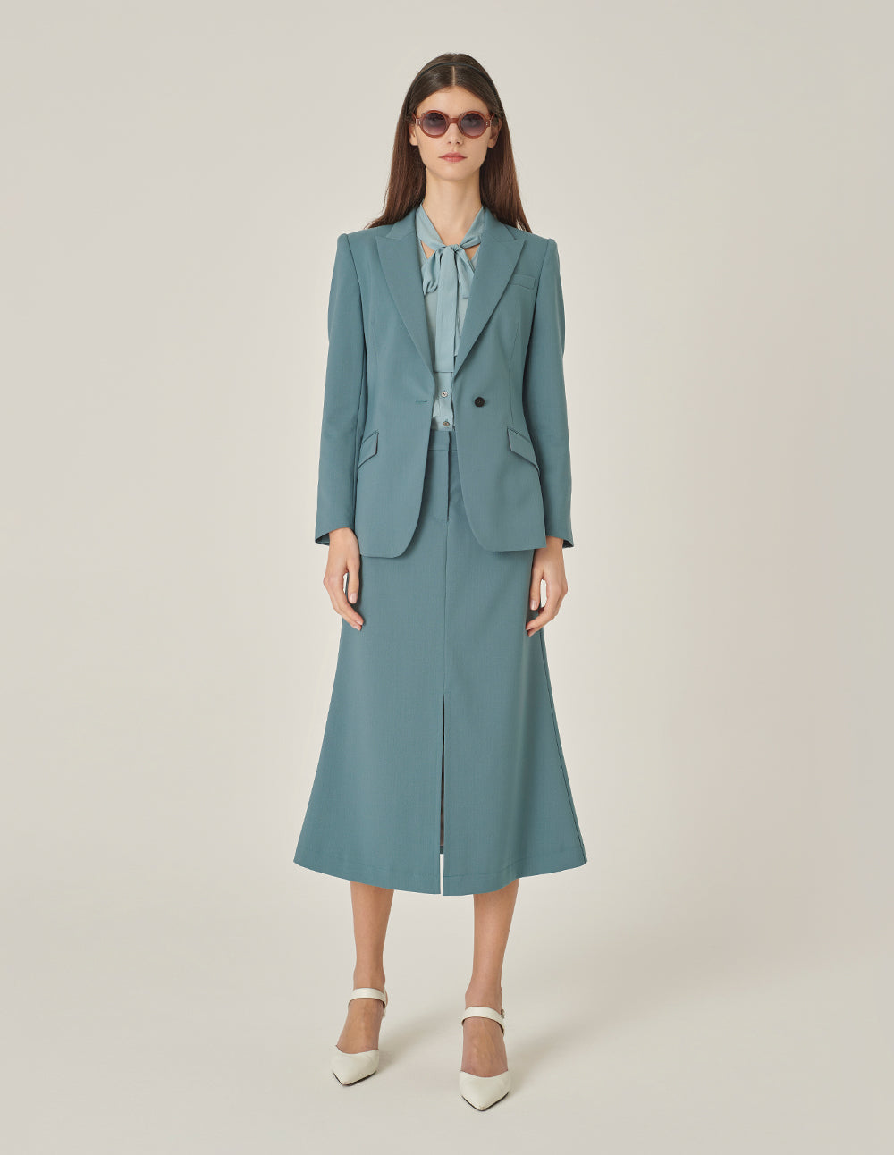 MARYLING's classic single‑breasted blazer, tailored with a waist‑defining cut and gently rounded hem, offers refined simplicity. In a soft mist blue with a hint of green, it balances intellectual calm with subtle, modern personality.