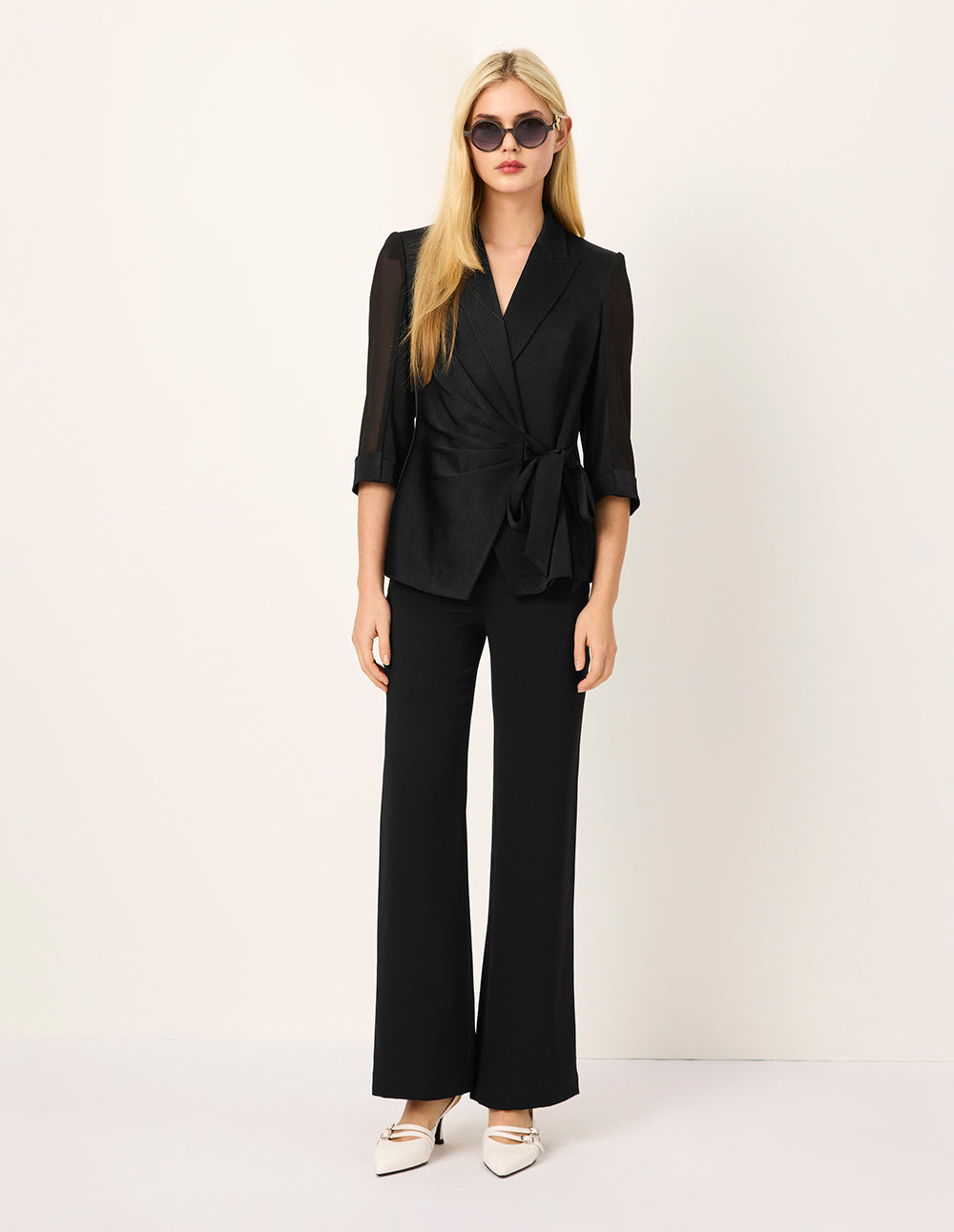 MARYLING's black suit jacket features a pleated lapel and waistline that extends into a bow‑tie detail, cinched at the waist for a refined silhouette. The three‑quarter sleeves are accented with georgette insets, adding a touch of delicate allure. Paired with the tailored waist‑defining cut, this design makes elegance feel effortless.
