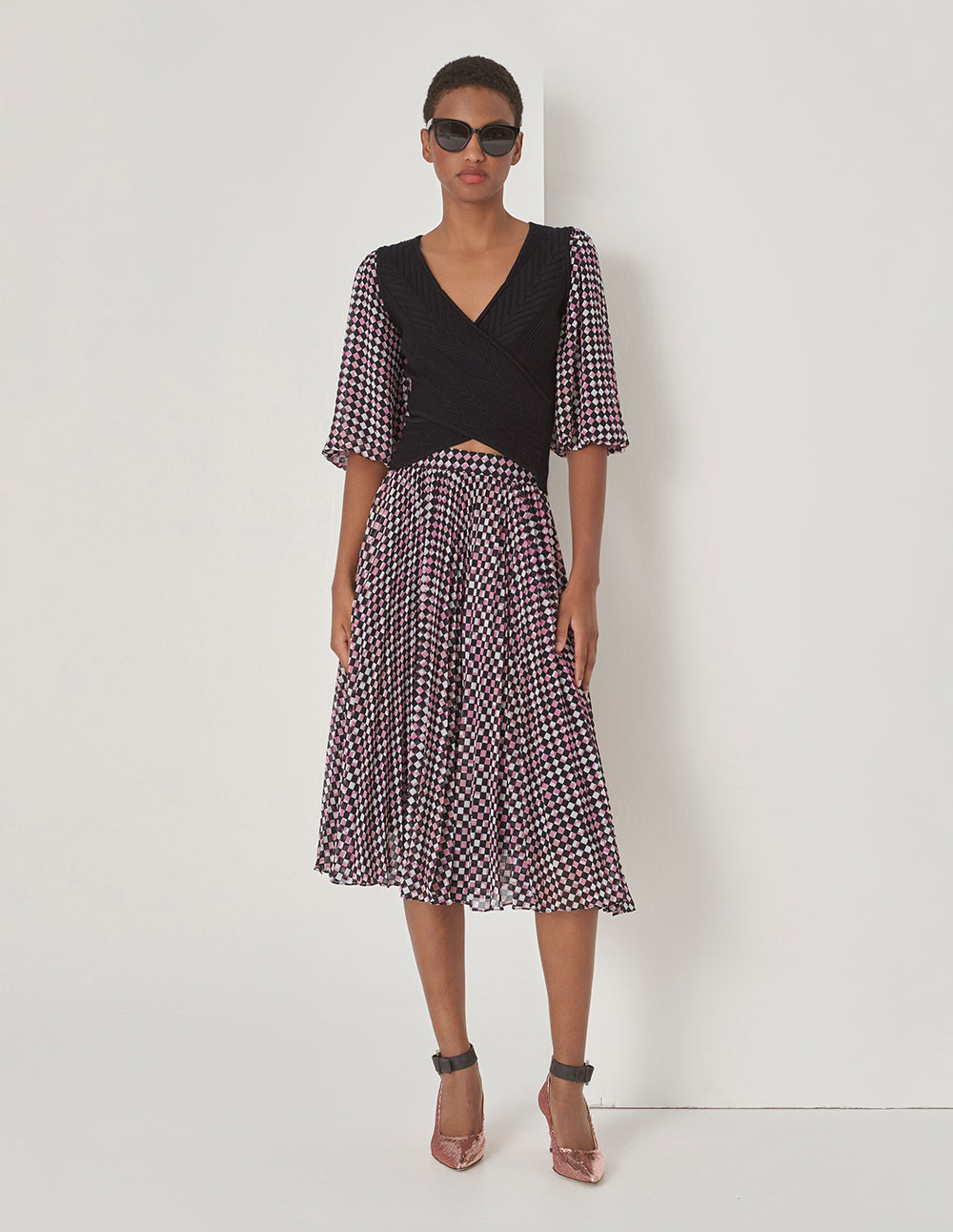MARYLING's blouse combines a black wool‑knit body with a crossover V‑neck and micro‑sheer georgette printed inserts, adding lightness and feminine allure. Style it with skirts featuring the same print.