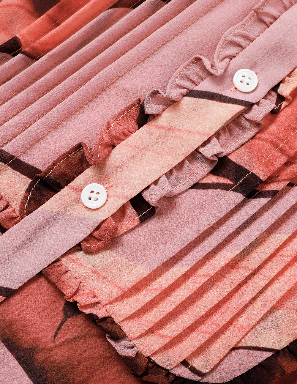 The print is rendered in ink‑wash dyeing, where light, rhythmic brushstrokes create a full artistic expression. Soft shades of red are deftly blended to evoke a refined, gentle lifestyle. MARYLING's georgette top with a delicate stand‑up collar carries a light, elegant texture, its exquisite pleating adding a retro touch. The warm pink‑red hue flatters the skin, capturing both grace and femininity.