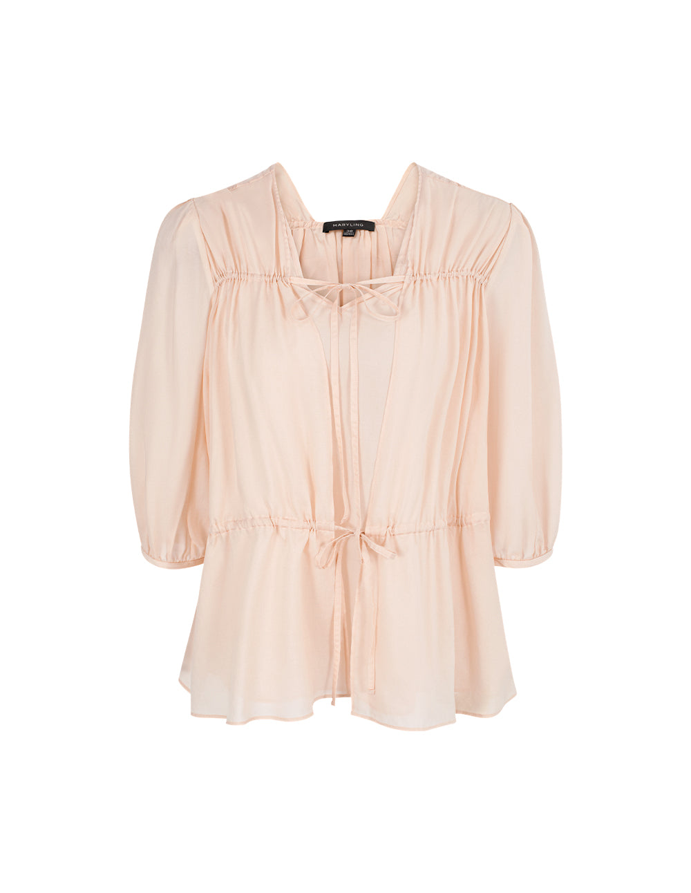 With an elegant, translucent quality in soft apricot, this piece features sculpted pinch‑pleats at the shoulders and waist that create graceful, fluid lines. Lantern sleeves offer soft volume, while gently gathered cuffs discreetly flatter the arms—every movement carries a hint of retro refinement.