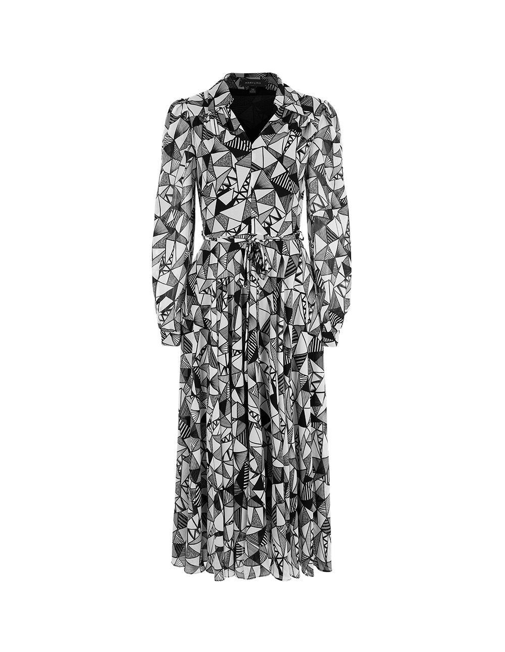 MARYLING's dress combines a tailored V‑neck shirt collar with a full, waist‑defining skirt, creating an elegant and polished silhouette. This piece embodies a soft, intellectual, and romantic style for the modern urban woman.