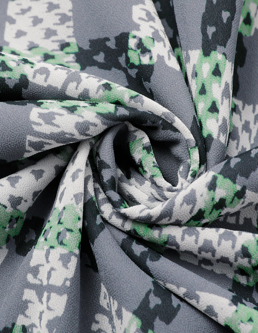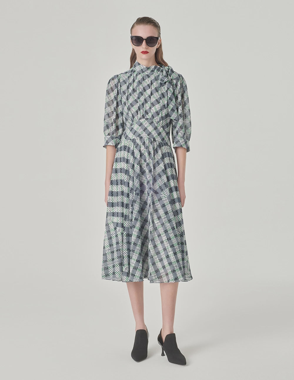 MARYLING's dress features an inverted V‑shaped waist detail that accentuates the natural curve, while ribbon accents at the neckline and an A‑line hem lend a romantic, feminine touch. The pattern reimagines chain links into a diverging plaid motif, creating a dynamic visual rhythm. The unique gray‑green hue adds a subtle, sophisticated distinction.