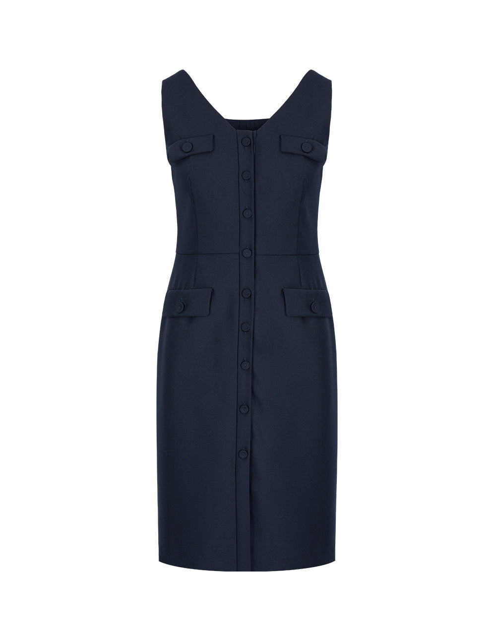 MARYLING's elegant dress in a midnight blue hue features a retro V‑neckline and a clean body‑skimming silhouette with multiple pockets. The above‑the‑knee length adds a polished finish, effortlessly capturing a glamorous yet feminine allure.