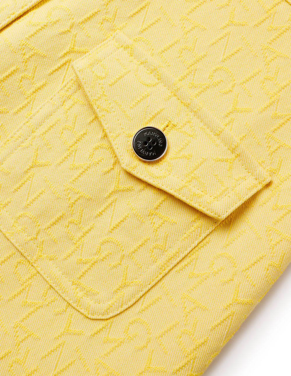 MARYLING reimagines denim with a colorful jacquard fabric, where a subtle logo is woven into the design for a fresh, artisanal touch. The fabric’s tonal floral jacquard adds depth, while a V‑neck, multi‑pocket detailing, and contrast buttons nod to a refined 1960s retro feel. A gentle A‑line skirt in lemon yellow completes the look with a bright, playful freshness.