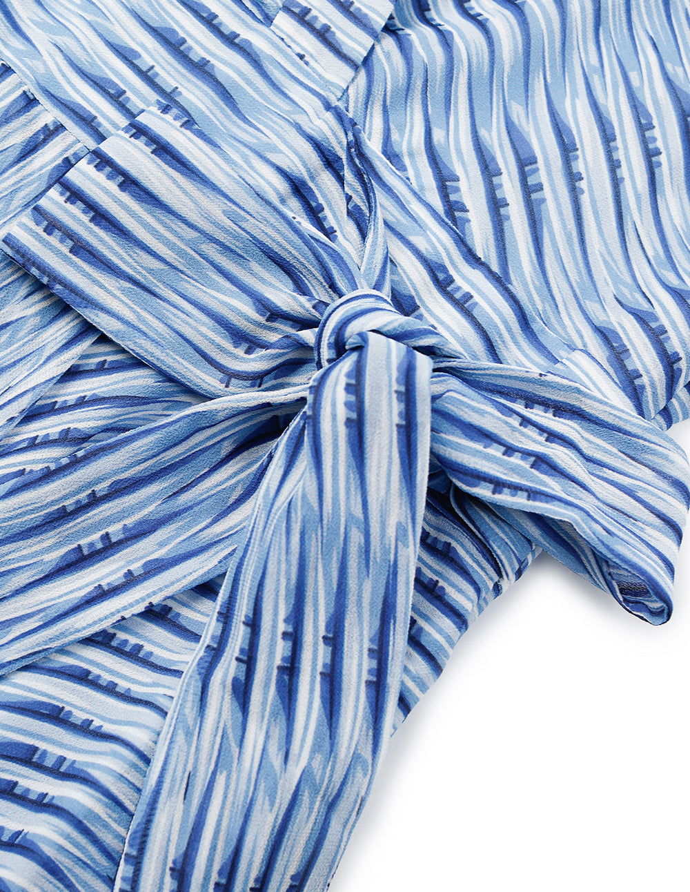MARYLING Lapel Stripe Print Empire-Waist Pleated Midi Wrap Dress