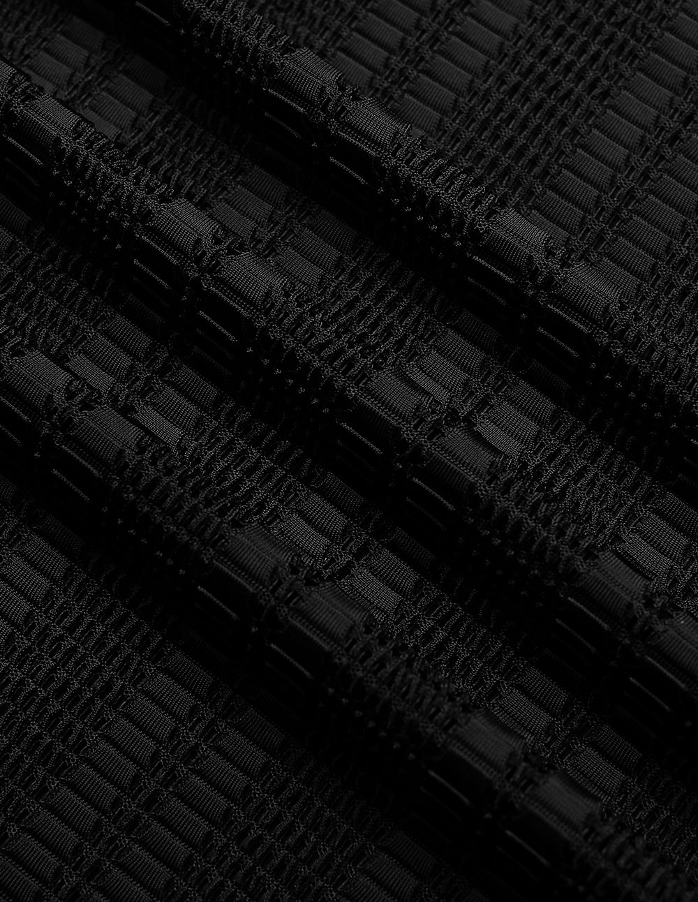 The outer layer is crafted from high‑density knit fabric, where a hollow‑out technique creates a striking contrast between raised stripes and openwork, resulting in a crisp texture that holds its shape. A special matte finish gives the black a rich oil‑painting‑like depth, while remaining wrinkle‑resistant with excellent drape.