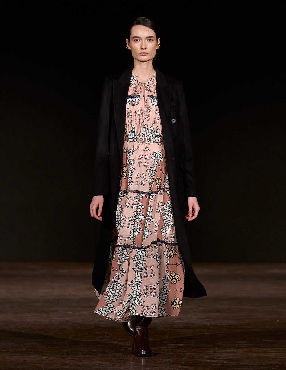 This dress is a step through time—a tribute to vintage elegance. The silhouette follows a soft “golden ratio,” with a cinched waist that curves like a vine before flowing into a full, billowing skirt. As you walk, it moves with the lightness of unfolding petals, shaping the figure and lending your gait a graceful rhythm. The palette blends a soft, rosy pink with a warm brown base, evoking a Monet garden brought to life.