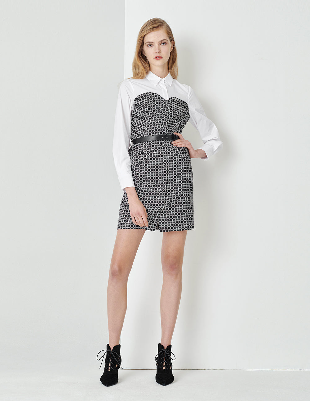 MARYLING Black And White Plaid Fake Two-Piece Spliced Contrast Colour Shirt Dress