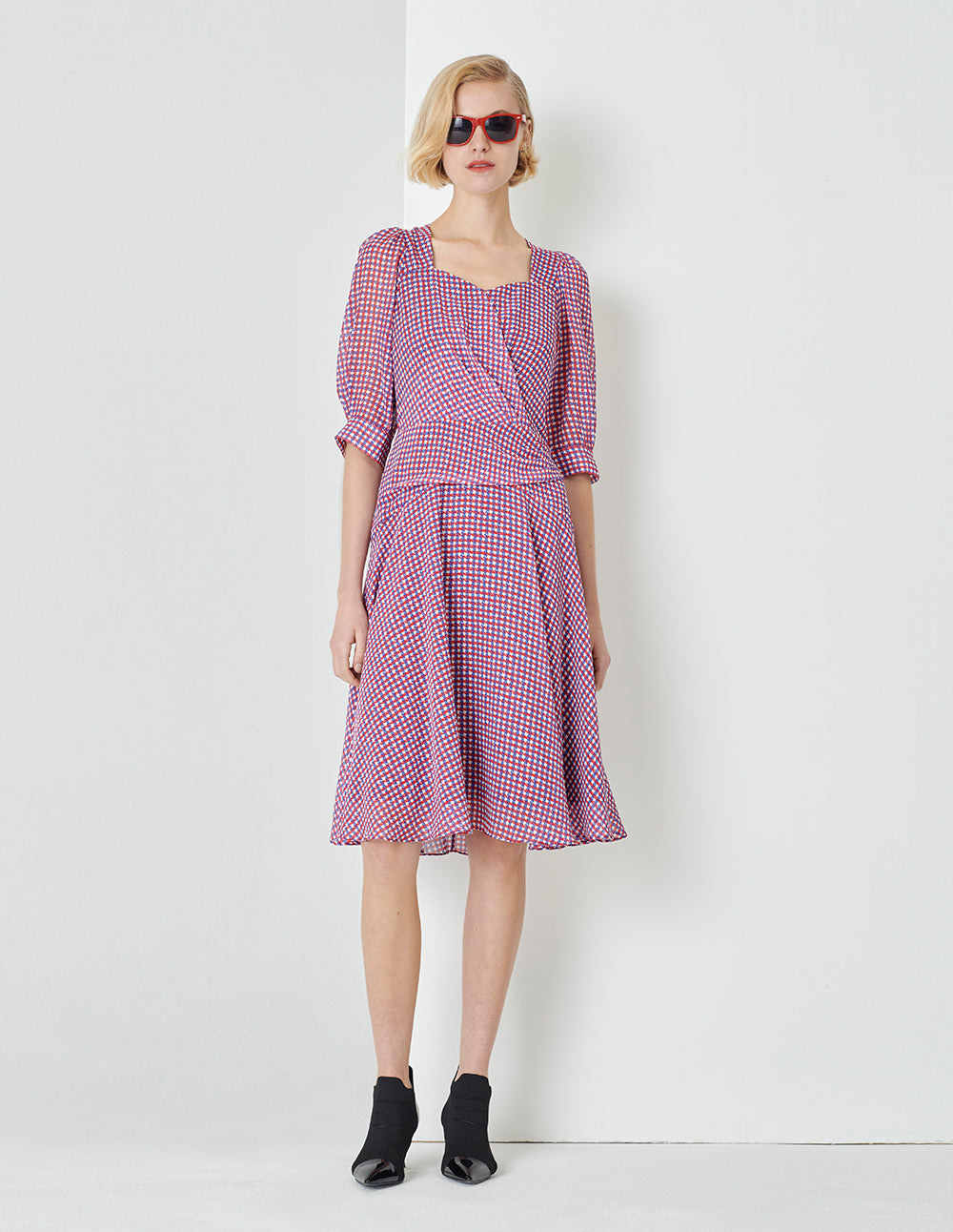 MARYLING Houndstooth Georgette Print Puff Sleeve Dress