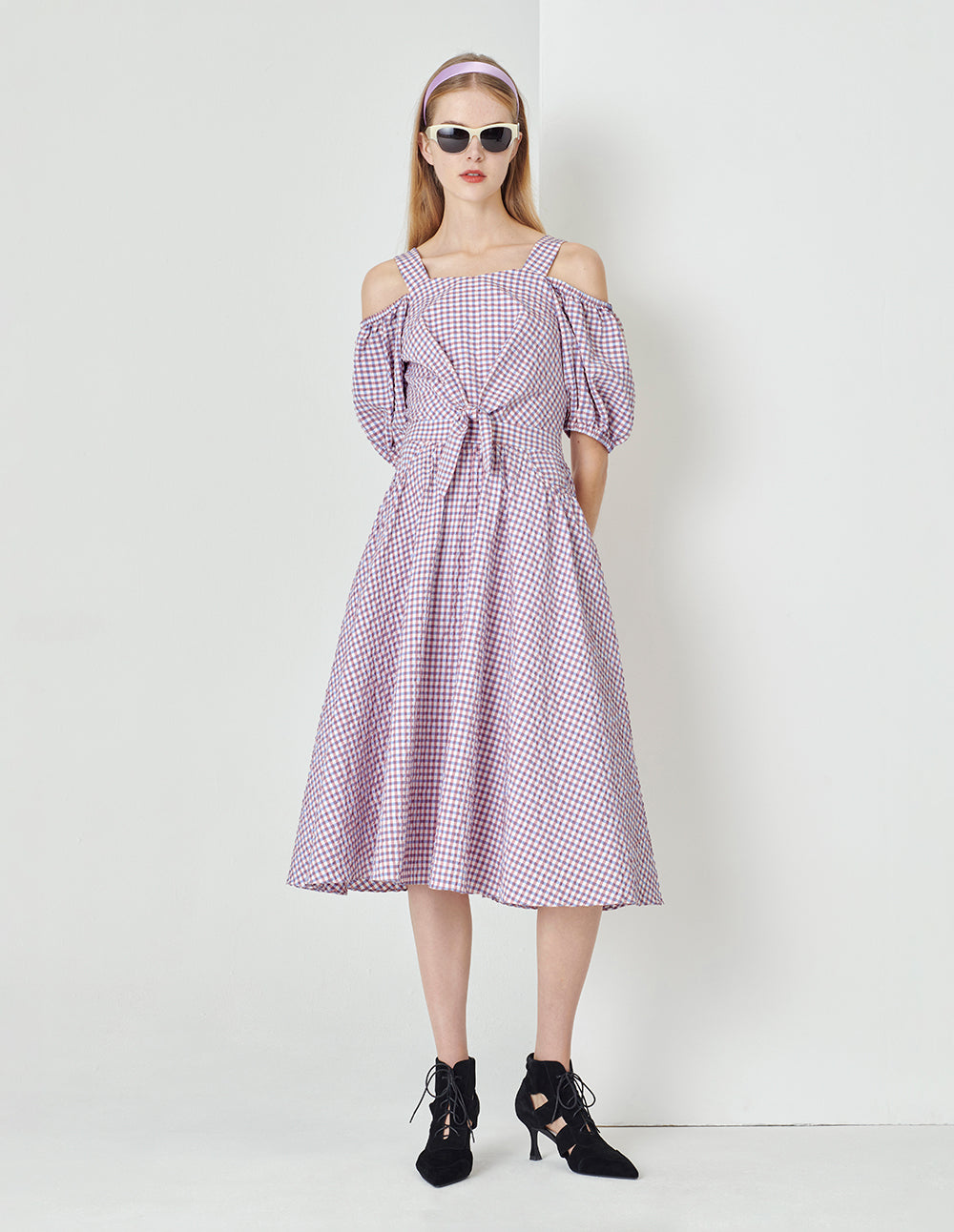 MARYLING Light Purple Checkered V-Neck Puff Sleeves Bowknot Decorated Dress