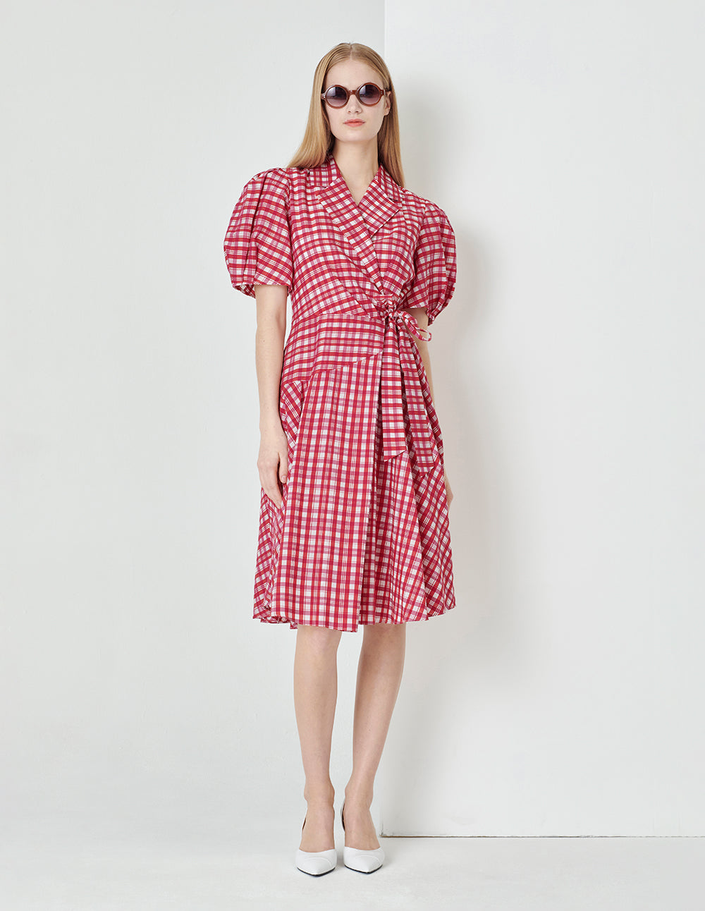 MARYLING Rose pink plaid suit collar puff sleeves plaid dress