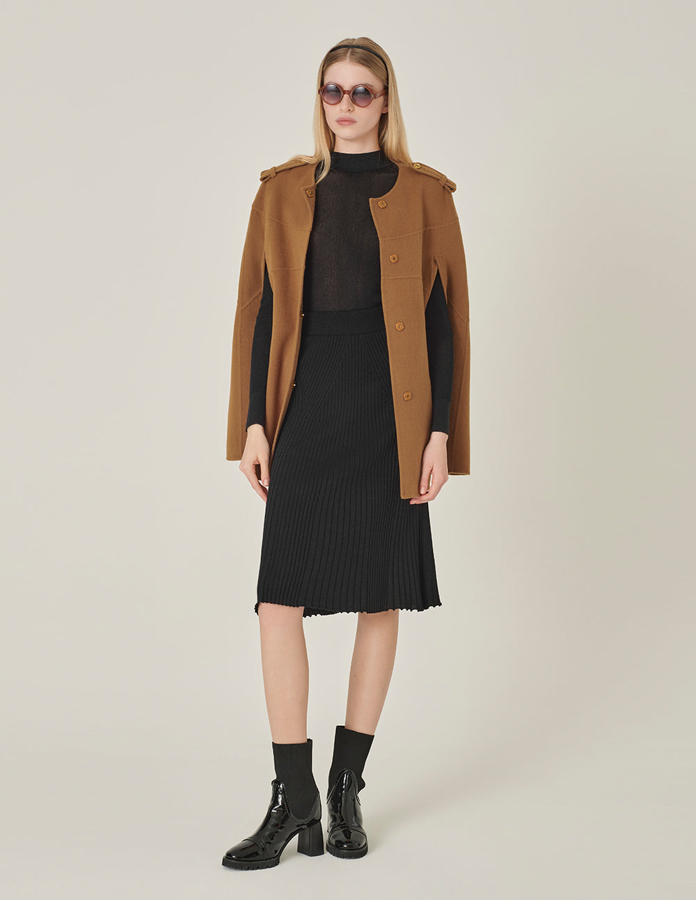 MARYLING’s cape-style jacket is rendered in a timeless caramel camel hue. A clean, sculpted curved seamline adds contemporary structure and enhances personal style. The slightly relaxed cut offers a touch of retro ease while remaining flattering across figures. The overall aesthetic is polished, versatile, and effortlessly chic.