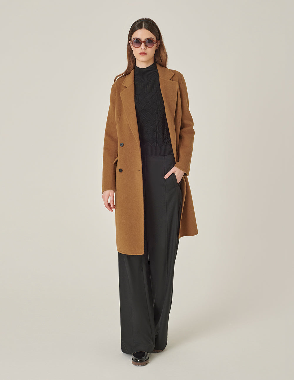 MARYLING Round-Neck Double-Breasted H-Shaped Camel-Colored Cashmere Coat