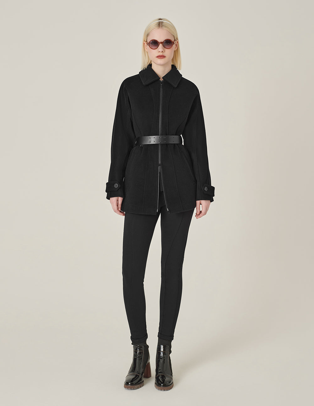 MARYLING Black Lapel Zipper Design Belted Double-Faced Coat