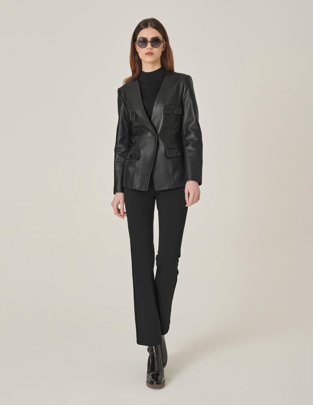 MARYLING Black Collarless Lambskin Blazer With Multiple Pockets
