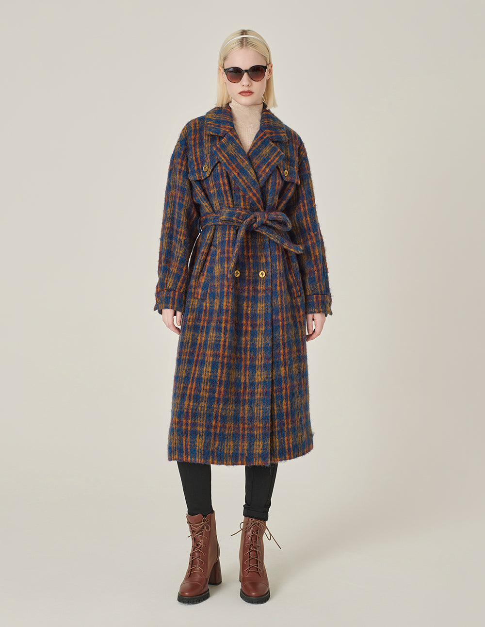 MARYLING Blue Loose Double-Breasted Long Tweed Wool Coat