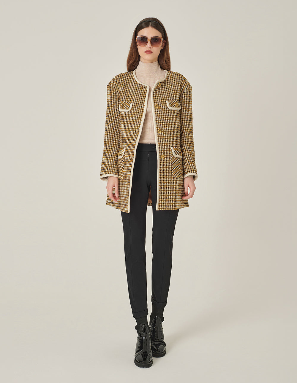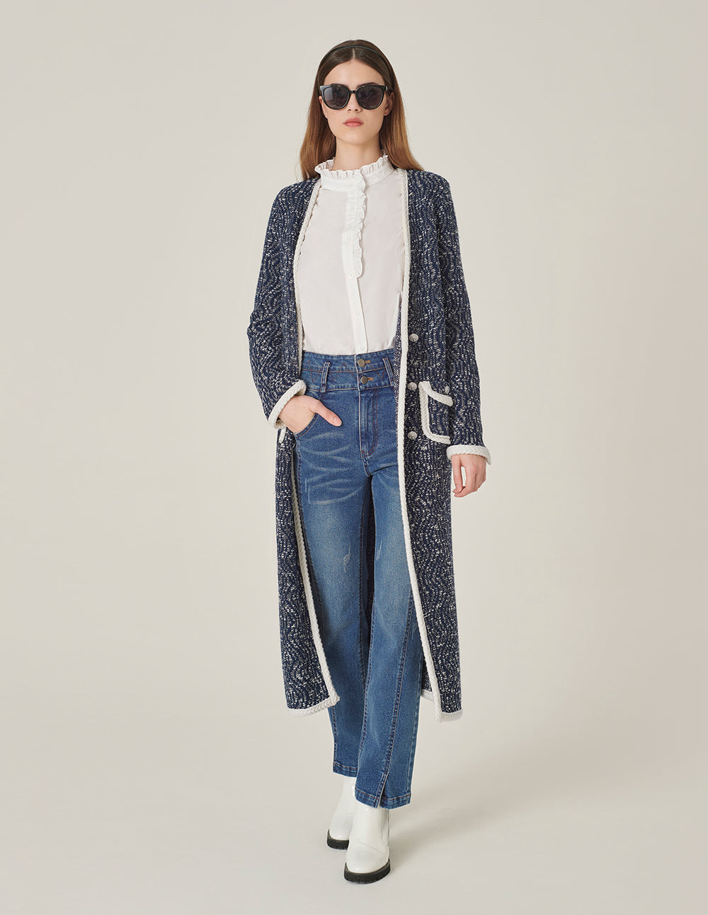 MARYLING V-Neck Long-Sleeve Straight Tweed Knitted Long Cardigan Jacket
