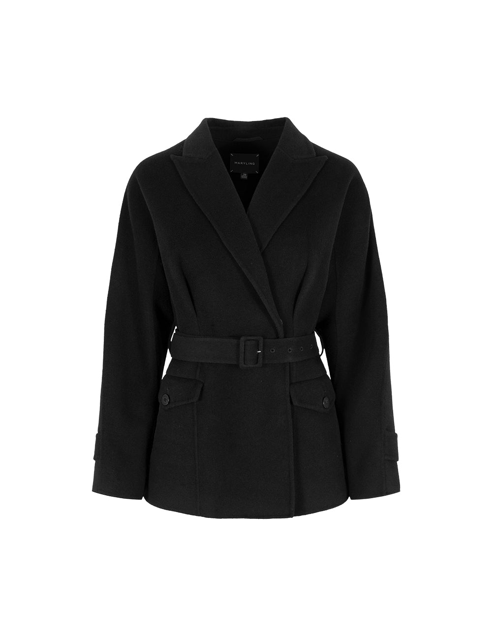 MARYLING Black Peak Lapel Double-Breasted Woolen-Sleeve Coat