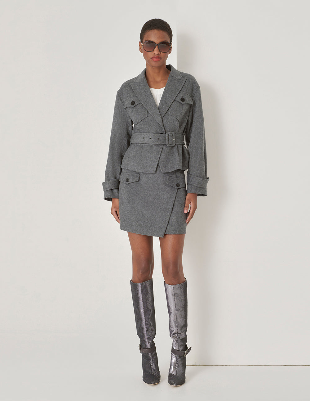 MARYLING Gray Lapel Collar Contrast Button Belted Jacket