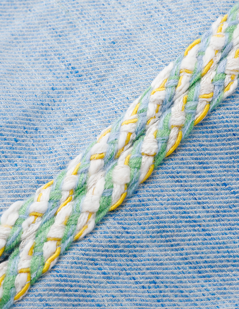 MARYLING's shorts combine blue‑and‑white yarns to create a soft washed‑denim texture, accented with light green twisted rope lacing and dark navy metal buttons. Designed to be layered under the matching jacket, or paired with a tee or knit vest for effortless summer style.