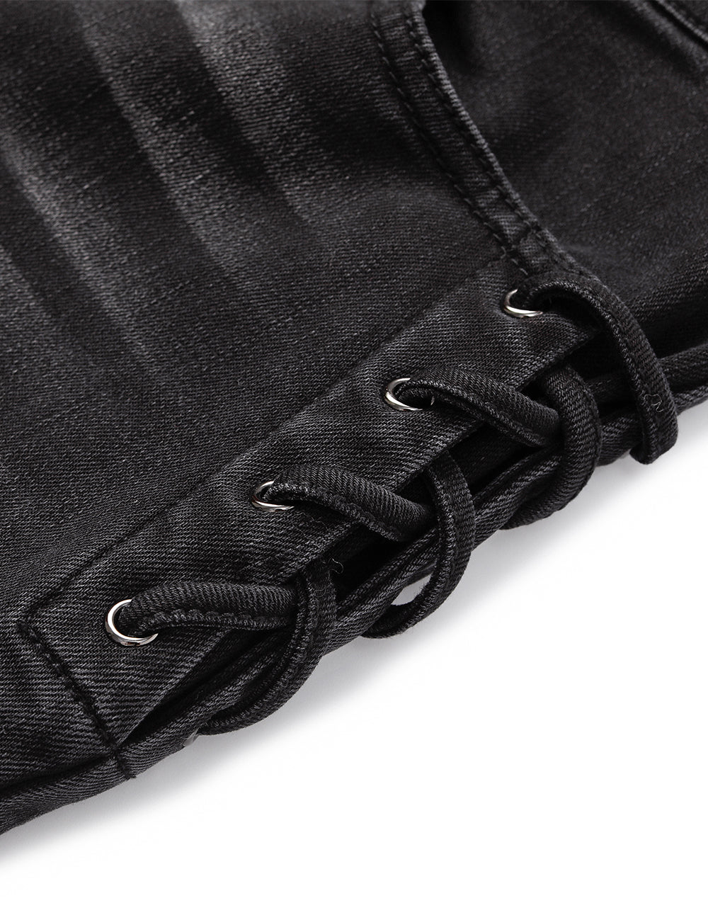 MARYLING's cropped harem pants blend a handsome, modern aesthetic with unique details. The lace-up pocket design adds distinctive character, while the smoky gray wash effect lends an air of calm, understated individuality to the overall look.