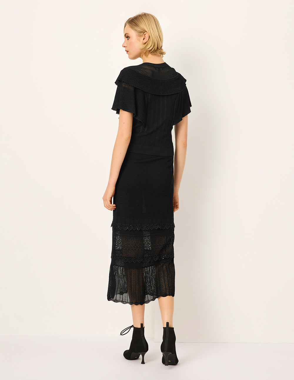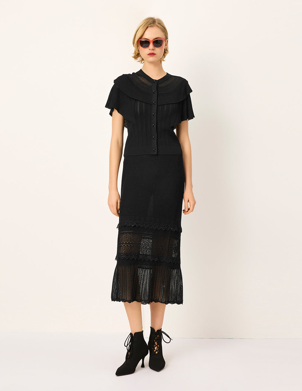 The intricate beauty of Baroque art is woven into this simple knitted cardigan. Double‑layered pleated ruffles at the shoulders and sleeves resemble blooming black roses, swaying gently with each movement; a delicate openwork texture hints at skin beneath, revealing an elegant, subtle glow.