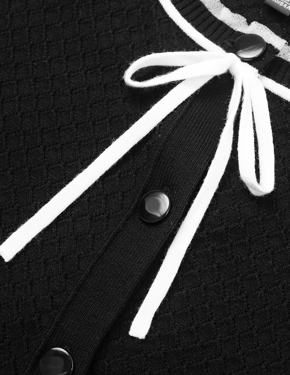 A delicate lace‑inspired round collar frames the neckline with elegance, while a bow tie adds a touch of playful charm. The openwork knit casts a subtle interplay of light and shadow on the skin. A stark black‑and‑white contrast defines a look that balances romantic ease with refined restraint.