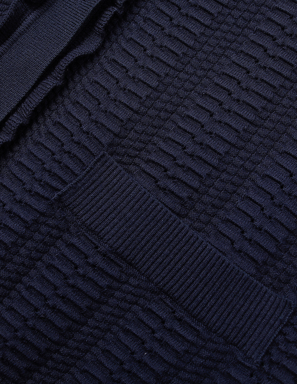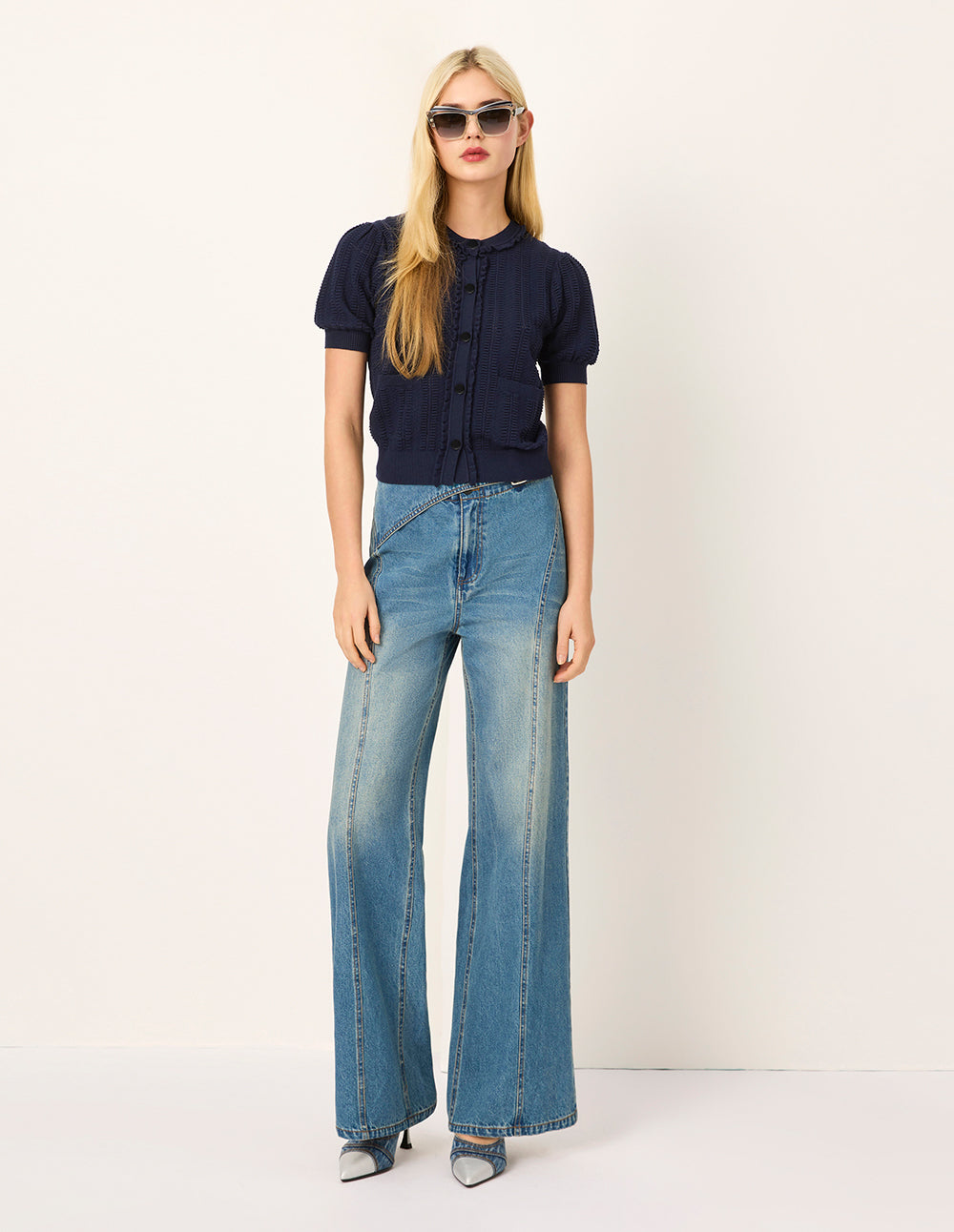 A petal‑like band collar wraps the neck, paired with a three‑dimensional textured knit that radiates romantic, retro charm with every movement. Moderately full puff short sleeves elegantly flatter the arms, while a deep, serene dark blue hue brightens the complexion and enhances your style without being demanding on skin tone.