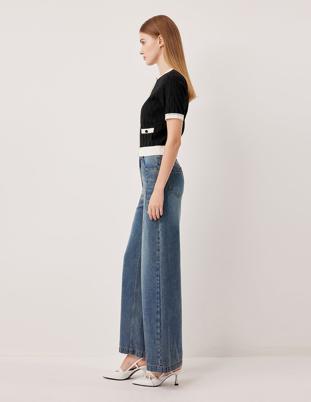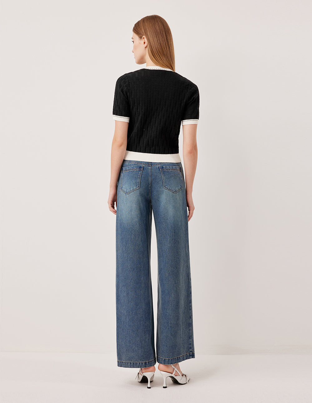 This cardigan reinterprets the classic black‑and‑white aesthetic with a three‑dimensional plaid weave. A small rounded collar outlines understated elegance, white contrast piping traces the silhouette like a sketched line, and metal buttons provide a refined finishing touch.