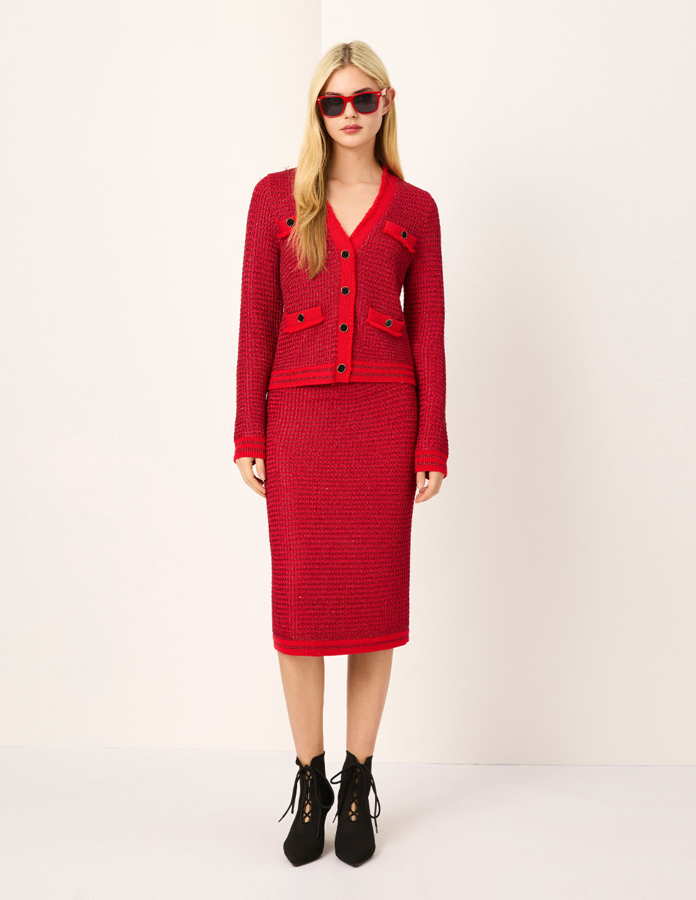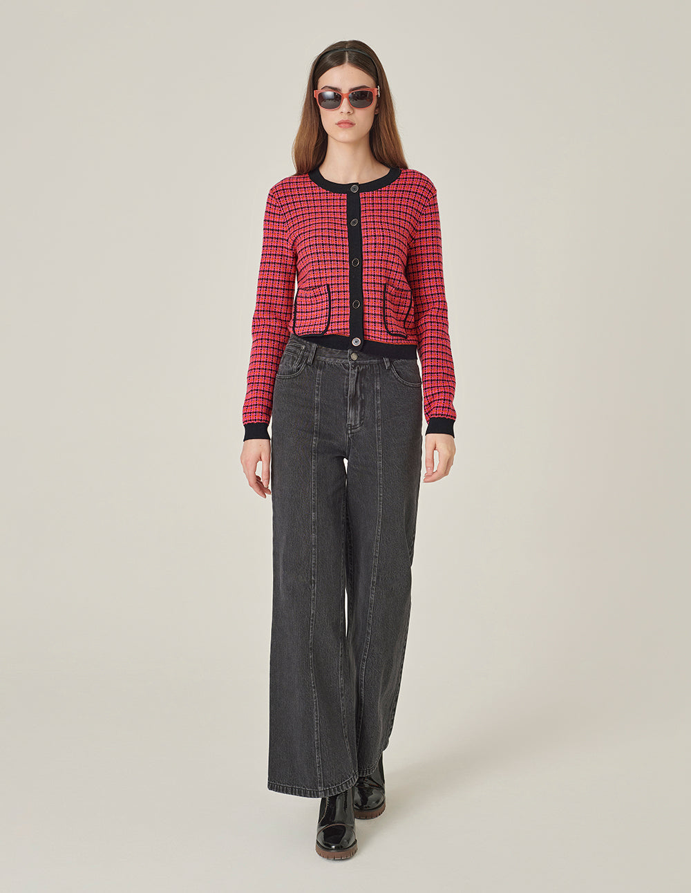 MARYLING V-Neck Red & White Checkered Tweed Multi-Pockets Knit Cardigan