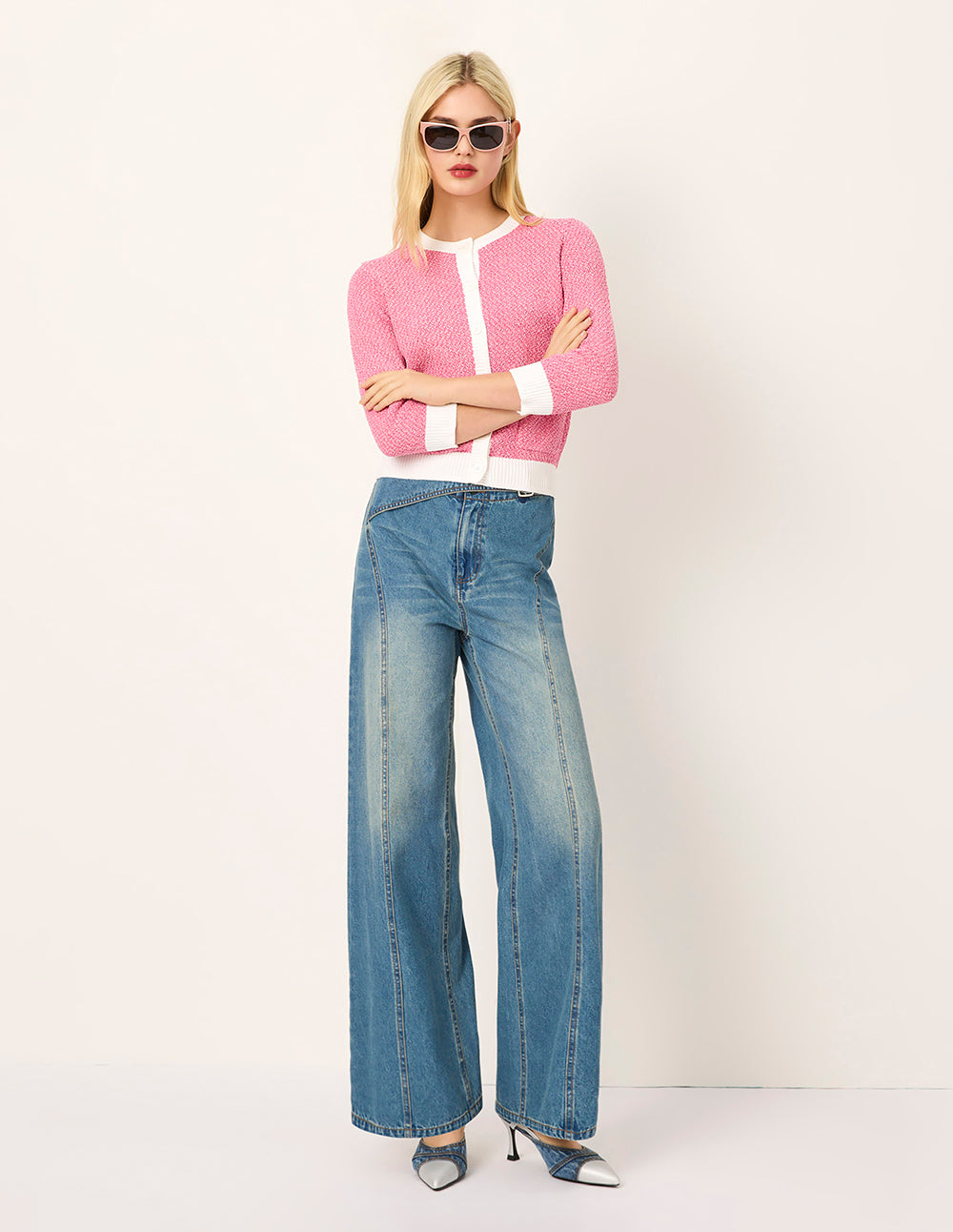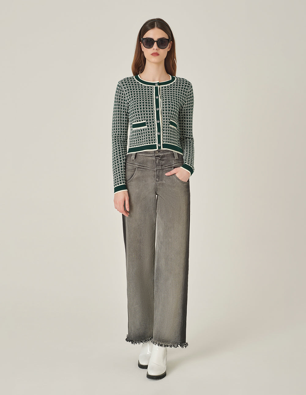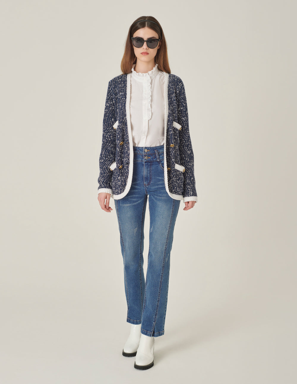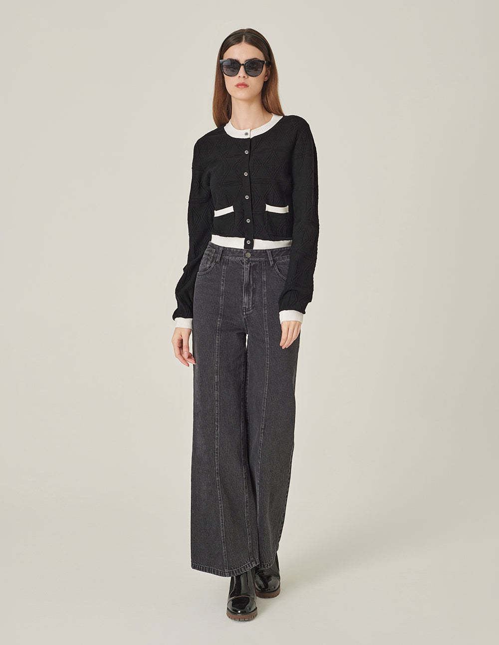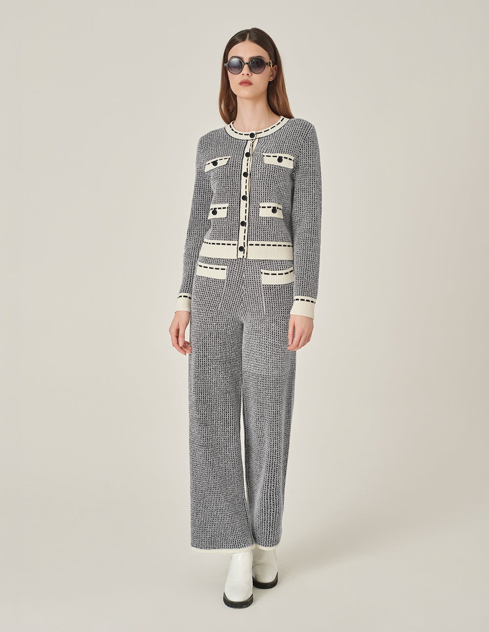 MARYLING Round Neck White Trim Long-Sleeve Knit Cardigan